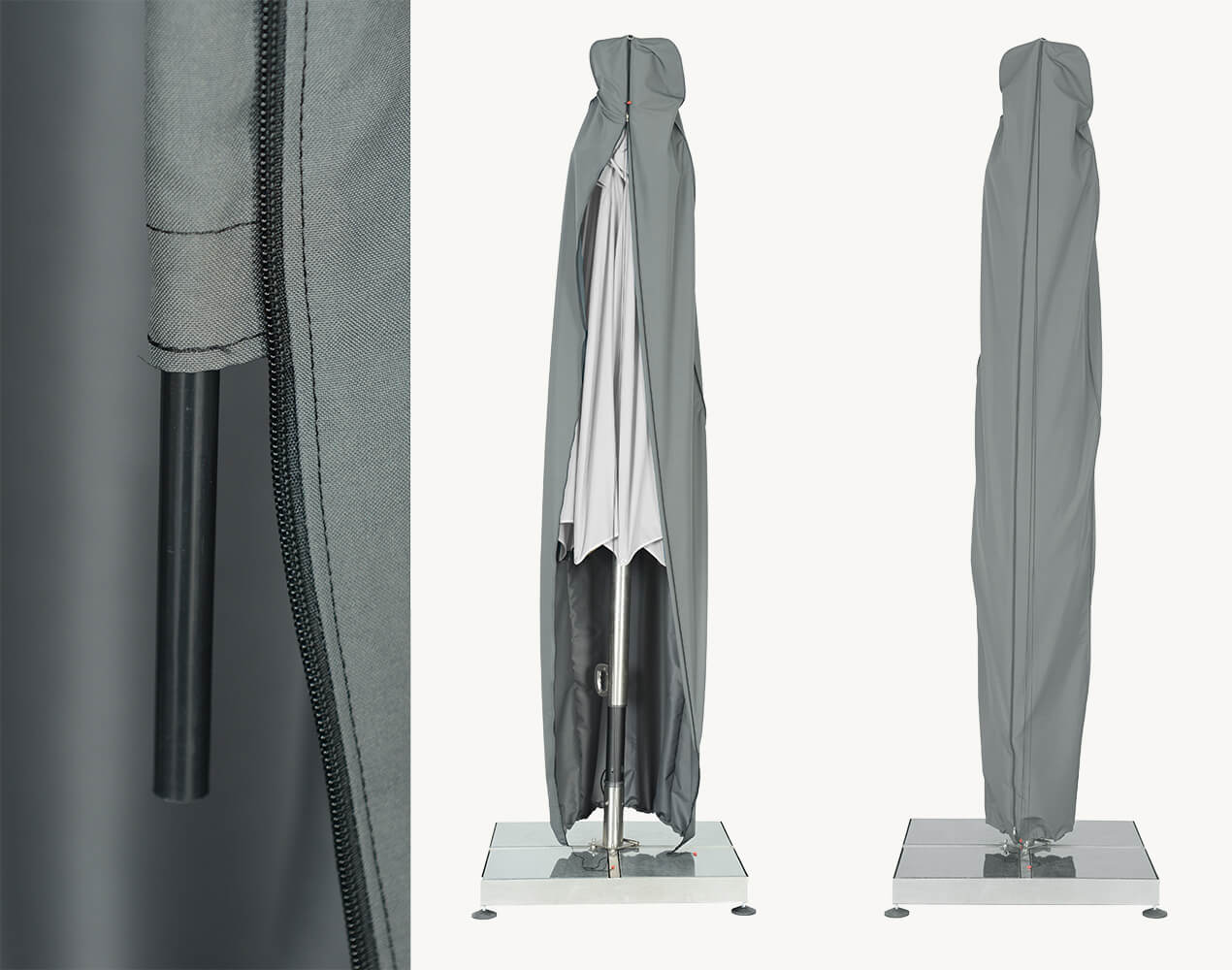 Pokrowce zostały zaprojektowane z myślą o wygodnym przechowywaniu parasola poza sezonem oraz dodatkowej ochronie w czasie, gdy nie jest używany.