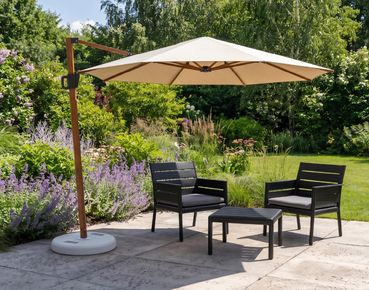 Przy wyborze parasola ogrodowego warto wziąć pod uwagę kilka kluczowych kryteriów. Rozmiar czaszy Balerina to 3 metry średnicy – zapewnia komfortowy cień dla stołu z czterema do sześciu osób. Jeśli planujesz większe spotkania, rozważ parasole o większej powierzchni zacienienia, natomiast do kompaktowych balkonów lepiej sprawdzą się modele mniejsze. Okrągły kształt czaszy Balerina jest uniwersalny i harmonijnie komponuje się zarówno z klasycznymi, jak i nowoczesnymi aranżacjami. Boczne umieszczenie masztu daje pełną swobodę ustawienia mebli pod zacienieniem, co sprawdzi się szczególnie przy tarasach i w ogrodach, gdzie nie chcemy dzielić przestrzeni.