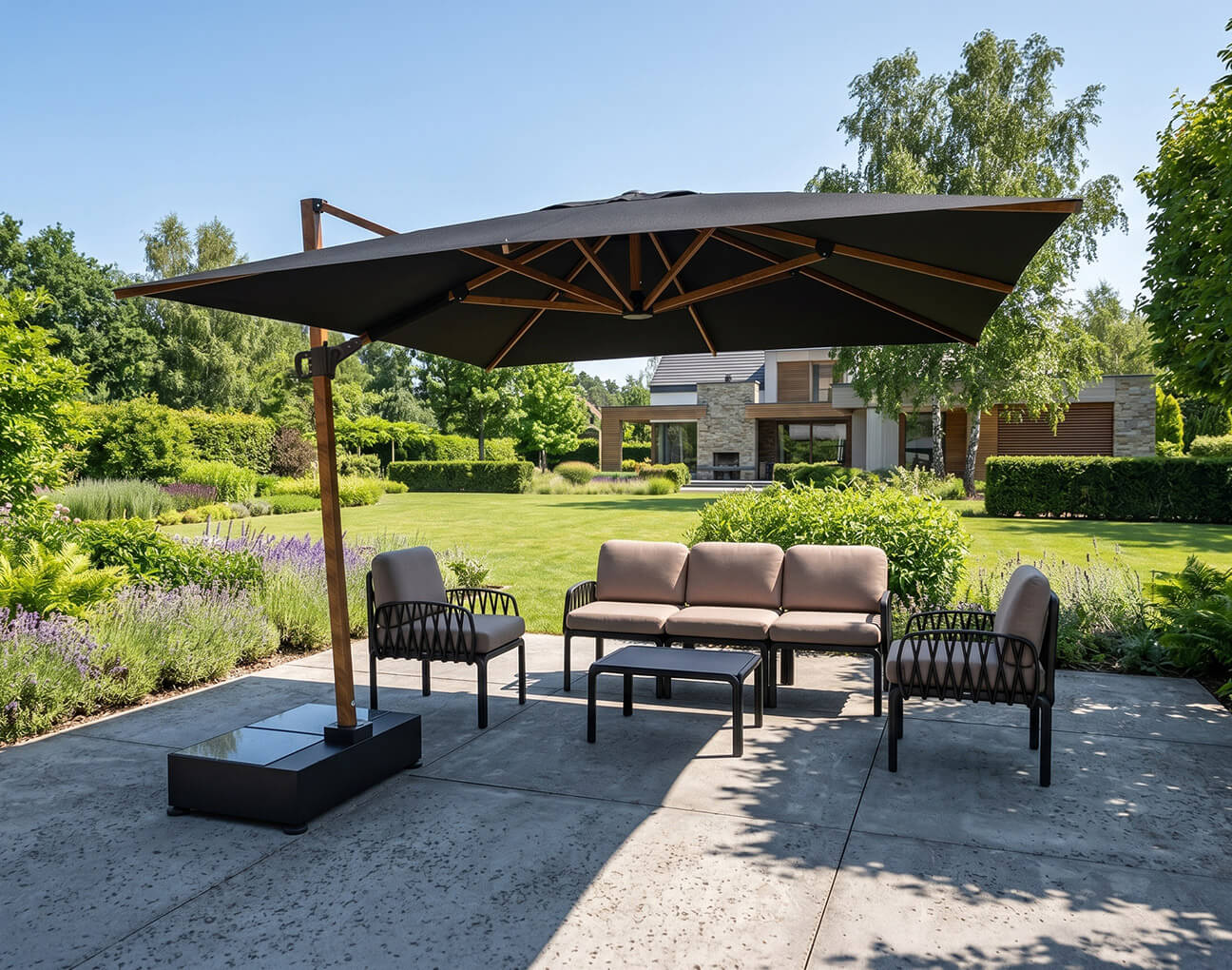 Egina to nowoczesny prostokątny parasol ogrodowy z bocznym masztu, który łączy komfort użytkowania, trwałość i wyjątkową estetykę. Dedykowany na tarasy i duże ogrody, stanowi idealne rozwiązanie do ochrony przed słońcem na większych przestrzeniach.