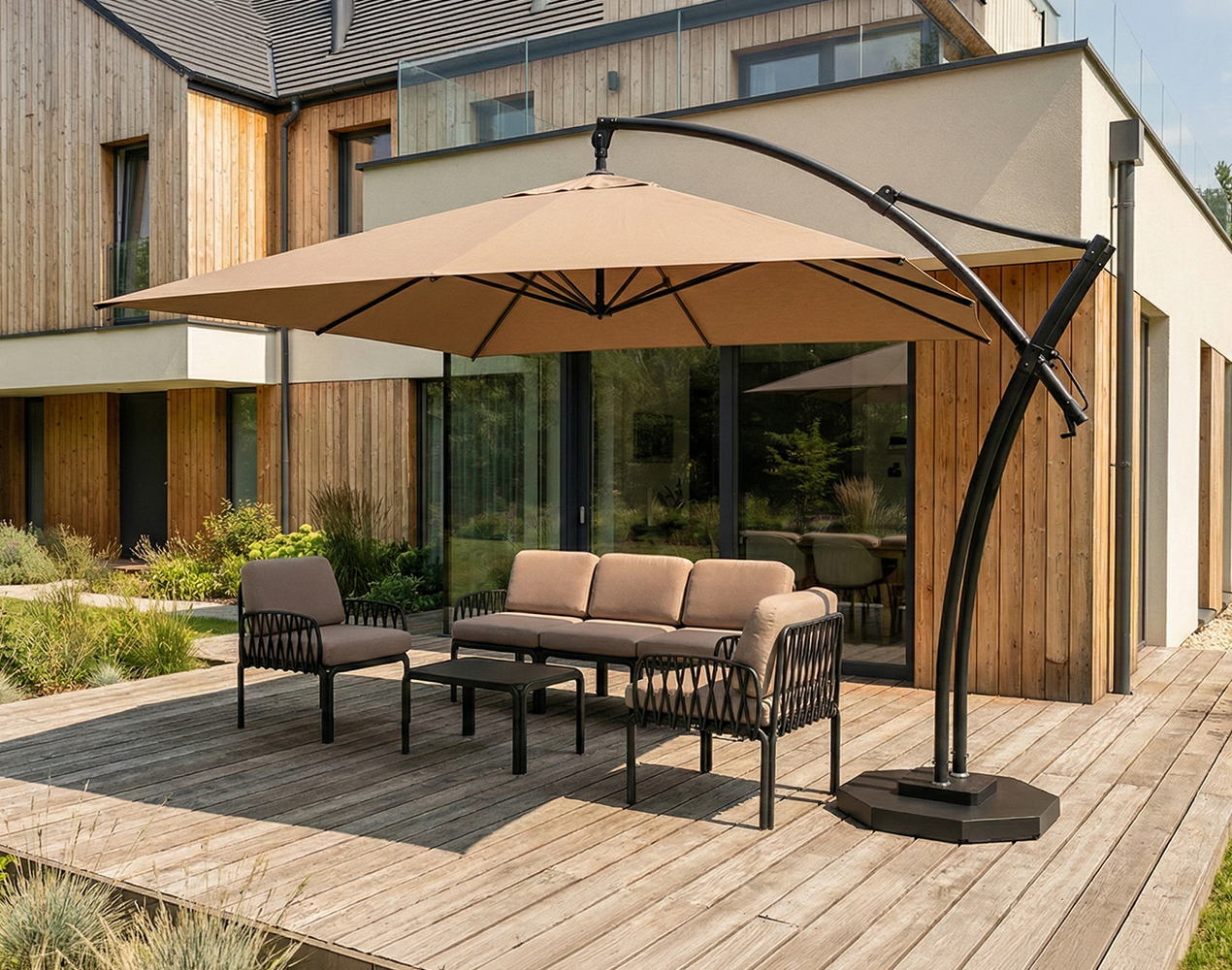 Parasol Ibiza Quattro to nowoczesny model wspornikowy z boczną nogą i kwadratową czaszą o szerokości aż 3,5 metry. Ten model zapewnia niezwykły komfort cienia w ogrodzie lub na tarasie, łącząc trwałość polskiej produkcji z funkcjonalnością oraz współczesną estetyką.