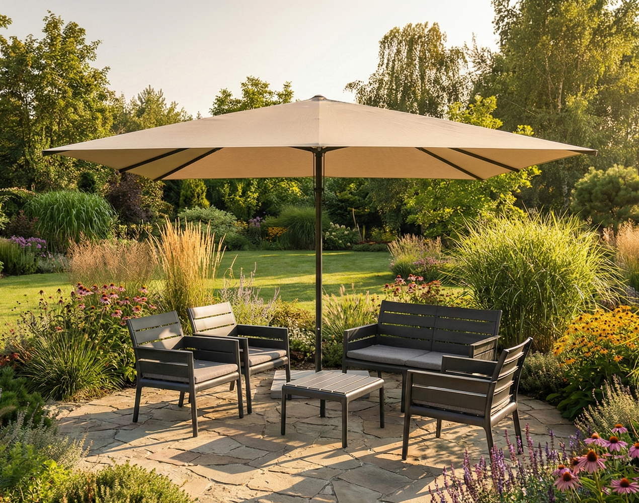 Parasol prostokątny Palamos to świetny wybór do wąskich, podłużnych przestrzeni – zarówno na tarasie, w ogrodzie, jak i w segmentach horeca, takich jak ogródki restauracyjne czy kawiarniane.