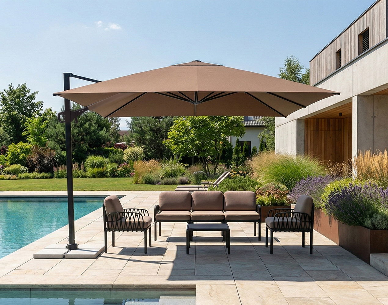 Wybierając model parasola Rio warto wziąć pod uwagę kilka kluczowych aspektów dopasowania do własnej przestrzeni. Rozmiar czaszy o bokach 3 metrów zapewnia aż 9 m² cienia — to rozwiązanie doskonałe dla średnich i większych ogrodów oraz tarasów. Kwadratowy kształt pozwala optymalnie zagospodarować przestrzeń i dopasować parasol do aranżacji mebli. Boczny maszt ułatwia ustawienie stołu czy kompletu wypoczynkowego bez konieczności przesuwania konstrukcji, co znacząco zwiększa komfort użytkowania. Jeśli miejsce relaksu jest ograniczone, ergonomiczne rozwiązania, takie jak obrót o 360°, pozwalają zmieniać położenie parasola bez konieczności przesuwania ciężkiej podstawy. W przestrzeniach horeca i dużych tarasach parasol Rio sprawdzi się także jako mobilna strefa komfortu dla wielu osób, zapewniając cień i ochronę przez cały dzień.