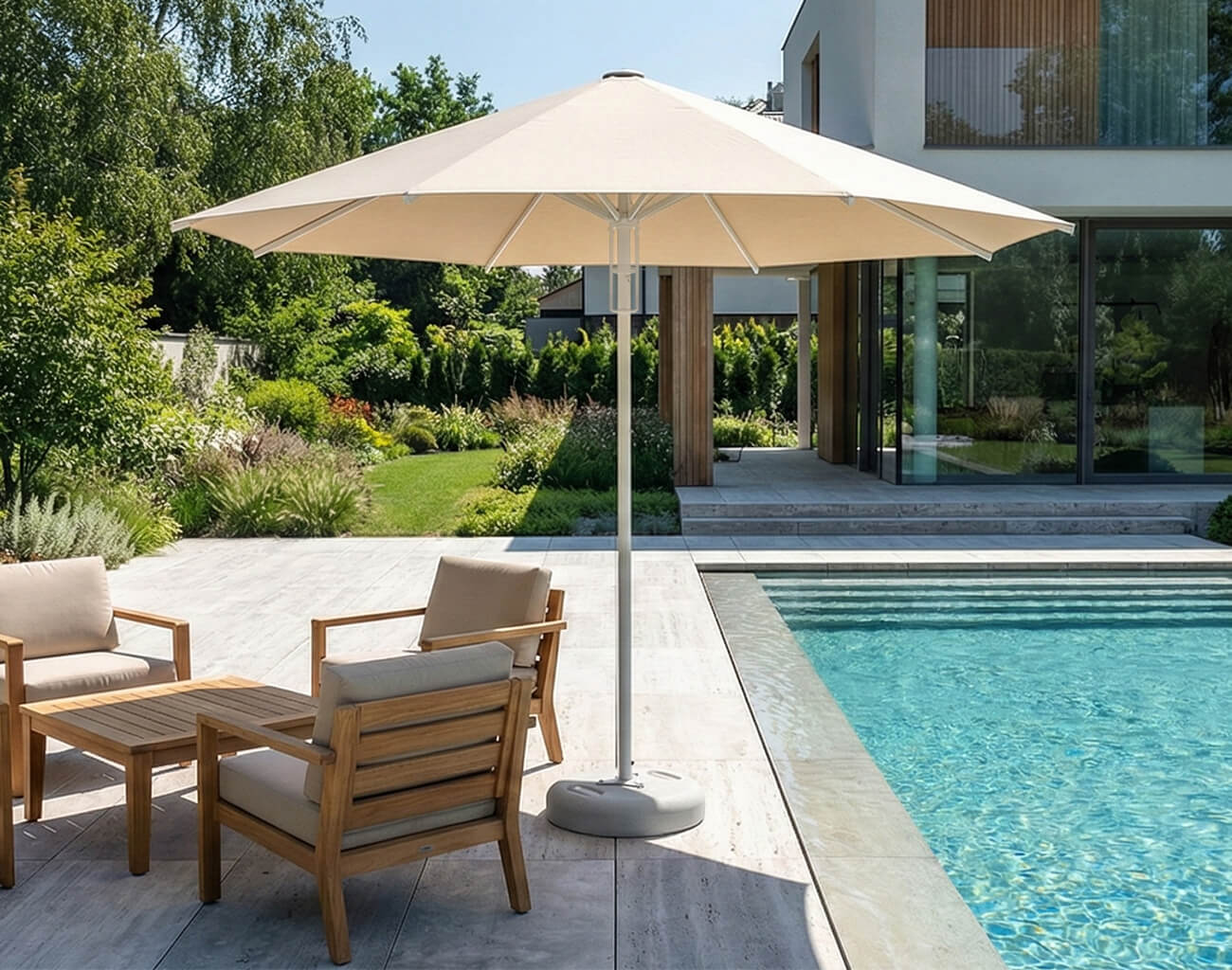 Parasol ma aluminiowy maszt malowany proszkowo oraz czaszę z wysokogatunkowego akrylu 270 g/m² lub poliestru 305 g/m², odpornego na blaknięcie i promieniowanie UV. To rozwiązanie na wiele sezonów intensywnego użytkowania.