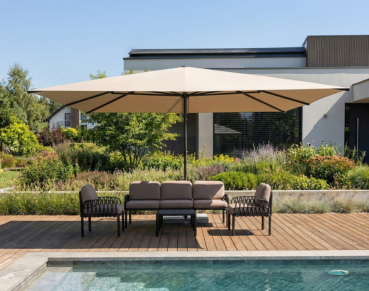 Prostokątny parasol ogrodowy szybko odmienia przestrzeń wokół domu lub restauracji, oferując chłodny cień i przyjemną atmosferę nawet podczas upalnych dni. Forma czaszy doskonale wpisuje się w linię nowoczesnych mebli, tworząc harmonijną i funkcjonalną całość. To idealny wybór do ustawienia przy długim stole jadalnianym na tarasie, wydzieleniu zacisznego miejsca relaksu lub osłonięcia większej grupy gości podczas spotkań towarzyskich.