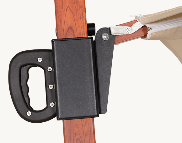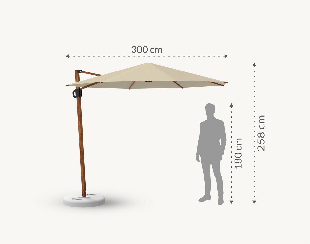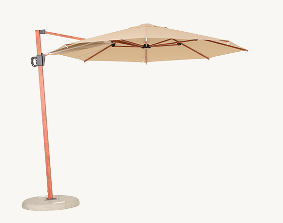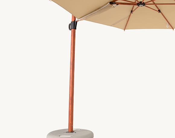 Parasol Balerina wyróżnia się elegancką, okrągłą czaszą o średnicy 3 m oraz bocznym masztem z trwałego aluminium w drewnopodobnym wykończeniu. To połączenie sprawia, że model harmonijnie wpisuje się w każdą przestrzeń ogrodu lub tarasu, podkreślając jego styl i zapewniając stabilność na co dzień.