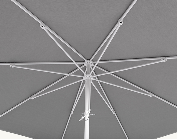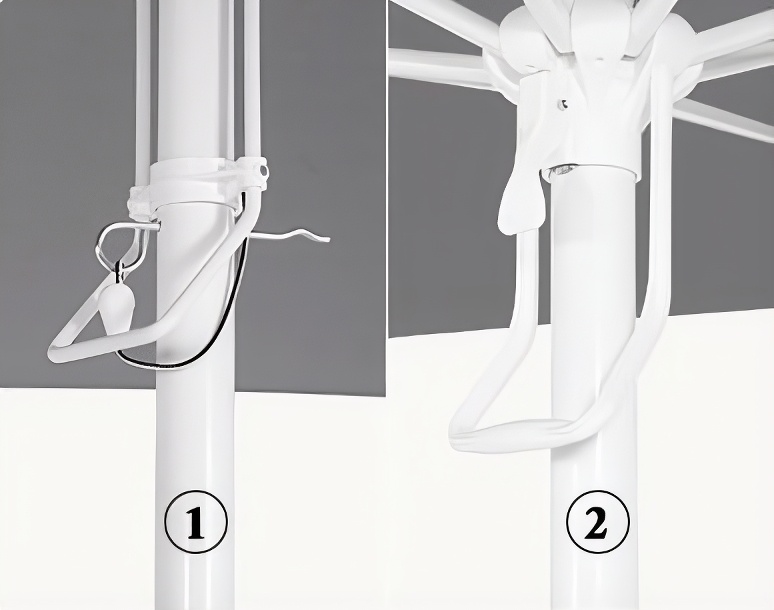 Parasol Barbados oferuje dwa praktyczne systemy otwierania dopasowane do rozmiaru czaszy. Mniejsze warianty (1) 2,5 m i 3 m wyposażono w mechanizm przeskok-rączka, który pozwala łatwo rozłożyć parasol i zabezpieczyć go przed przypadkowym zamknięciem. Większe modele (2) 3,5 m i 4 m posiadają teleskopowy system otwierania, co pozwala na wygodne zamykanie parasola nad blatem stołu, chroniąc meble i ułatwiając aranżację przestrzeni tarasowej.