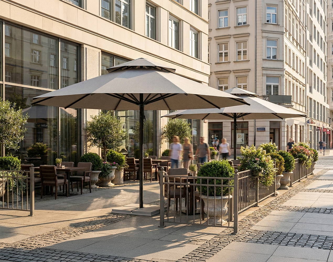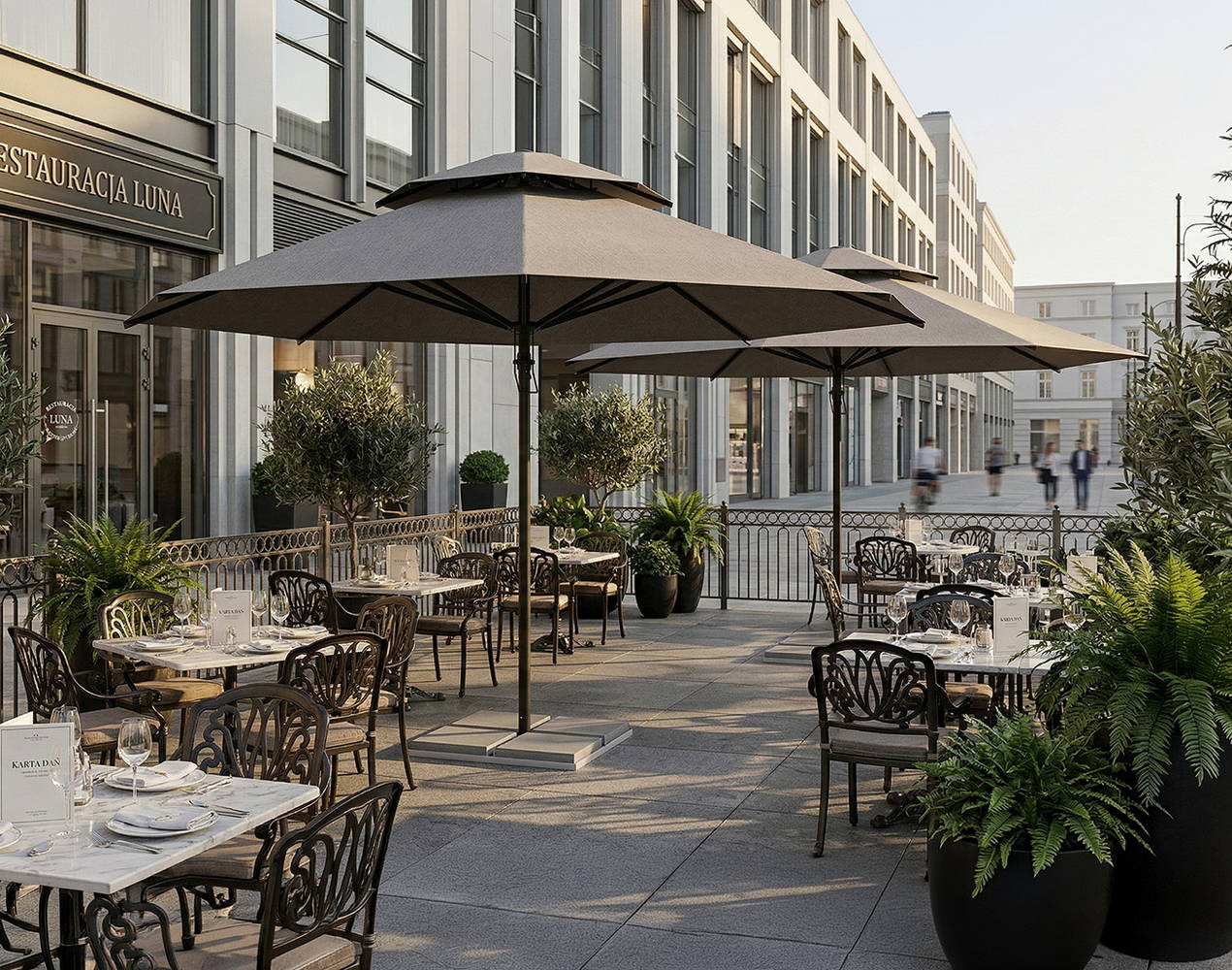 Wygoda personelu jest kluczowa – teleskopowy system otwierania modelu Vesuvio pozwala na zamykanie parasola nad blatem stołu, minimalizując konieczność przesuwania mebli. To rozwiązanie oszczędza czas i usprawnia obsługę gości, podnosząc ergonomię pracy w przestrzeniach komercyjnych.