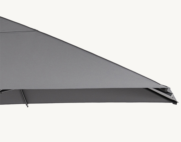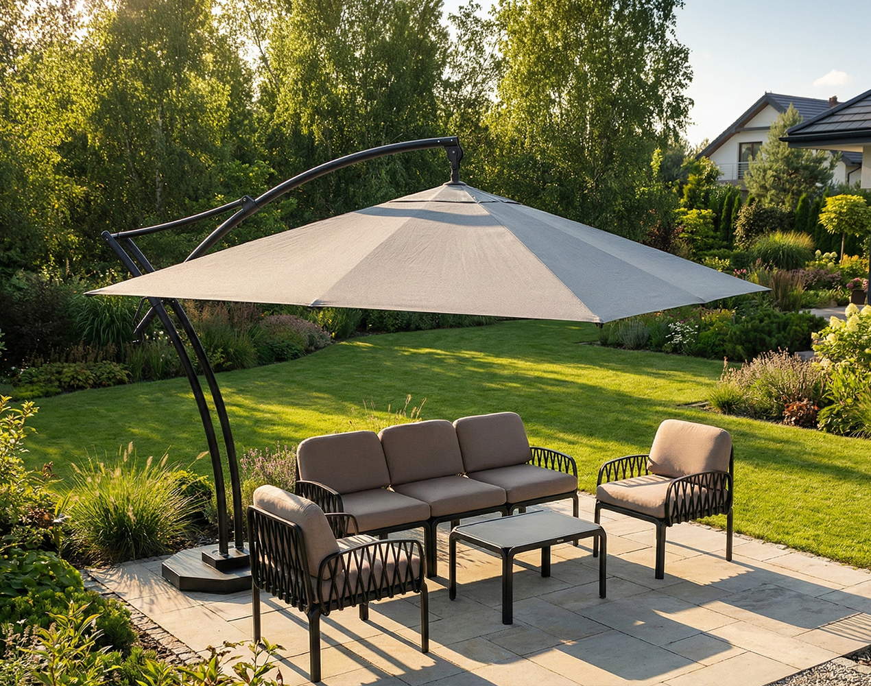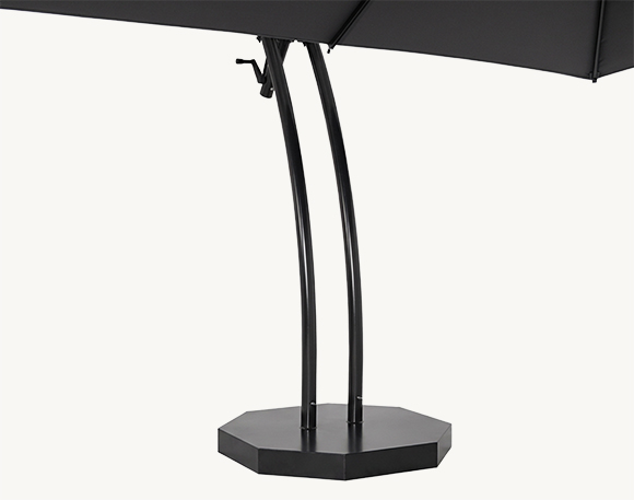 Dzięki bocznej nodze parasol Ibiza Quattro nie zajmuje miejsca na środku tarasu, co umożliwia lepsze zagospodarowanie przestrzeni. Solidna konstrukcja malowana proszkowo zapewnia stabilność i odporność, dając pewność użytkowania w codziennych warunkach.
