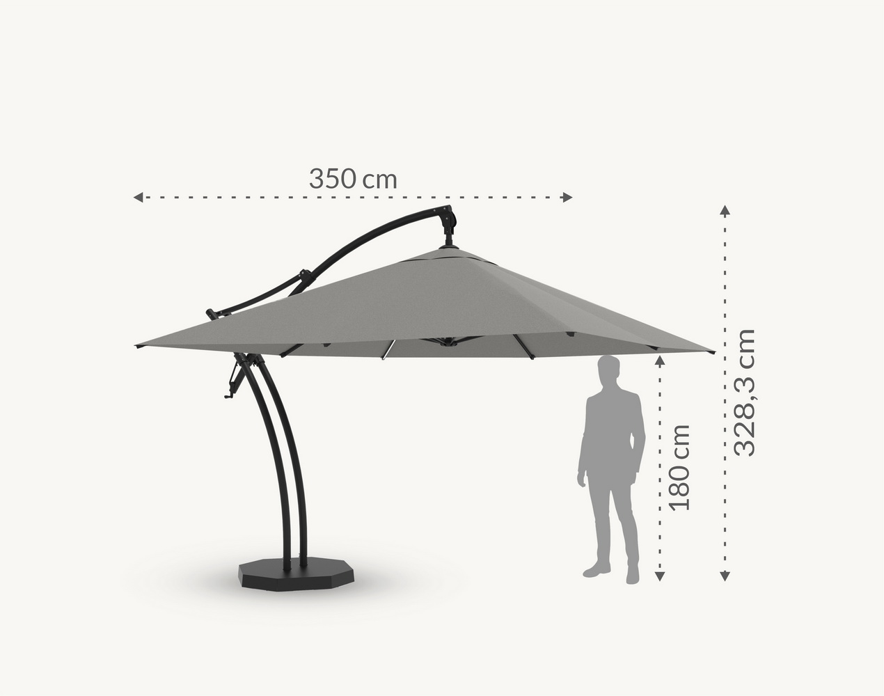 Parasol wspornikowy Ibiza Quattro z opcjonalnym oświetleniem LED tworzy komfortową atmosferę na tarasie zarówno za dnia, jak i po zmroku. Dodatkowy ściemniacz z funkcją zdalnego sterowania pozwala płynnie dostosować jasność światła z dowolnego miejsca, zapewniając wygodę i relaks w ogrodzie.