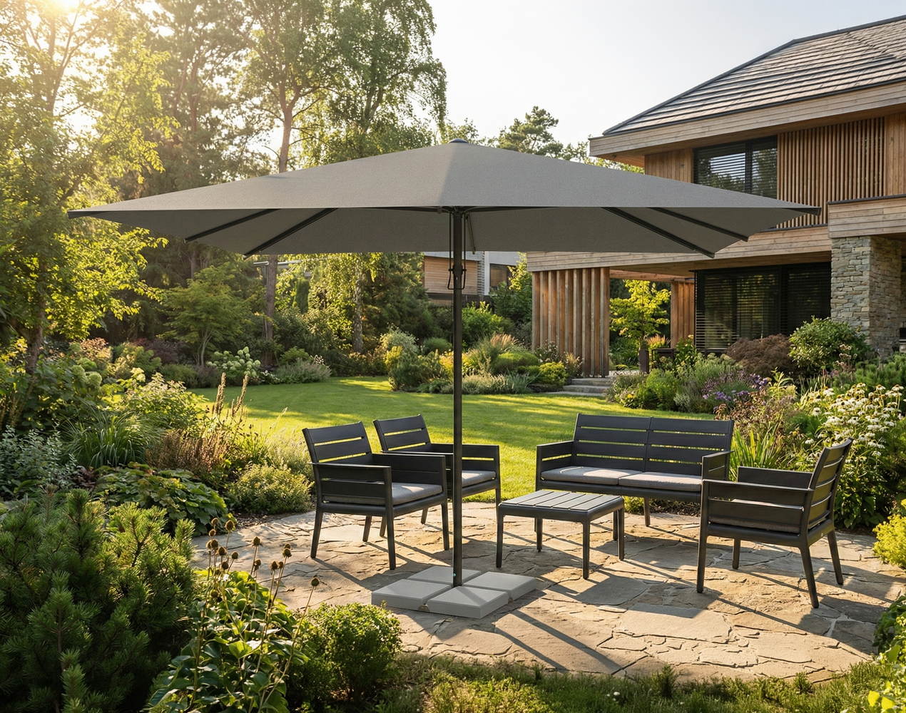 Duży parasol prostokątny Palamos to połączenie funkcjonalności i estetyki, które doskonale sprawdzi się w wąskich ogrodach, tarasach czy alejkach. Jego geometryczny kształt maksymalizuje powierzchnię cienia, zapewniając komfortowy relaks nawet na ograniczonej przestrzeni, zachowując przy tym elegancki design wpisujący się w nowoczesną aranżację ogrodu.