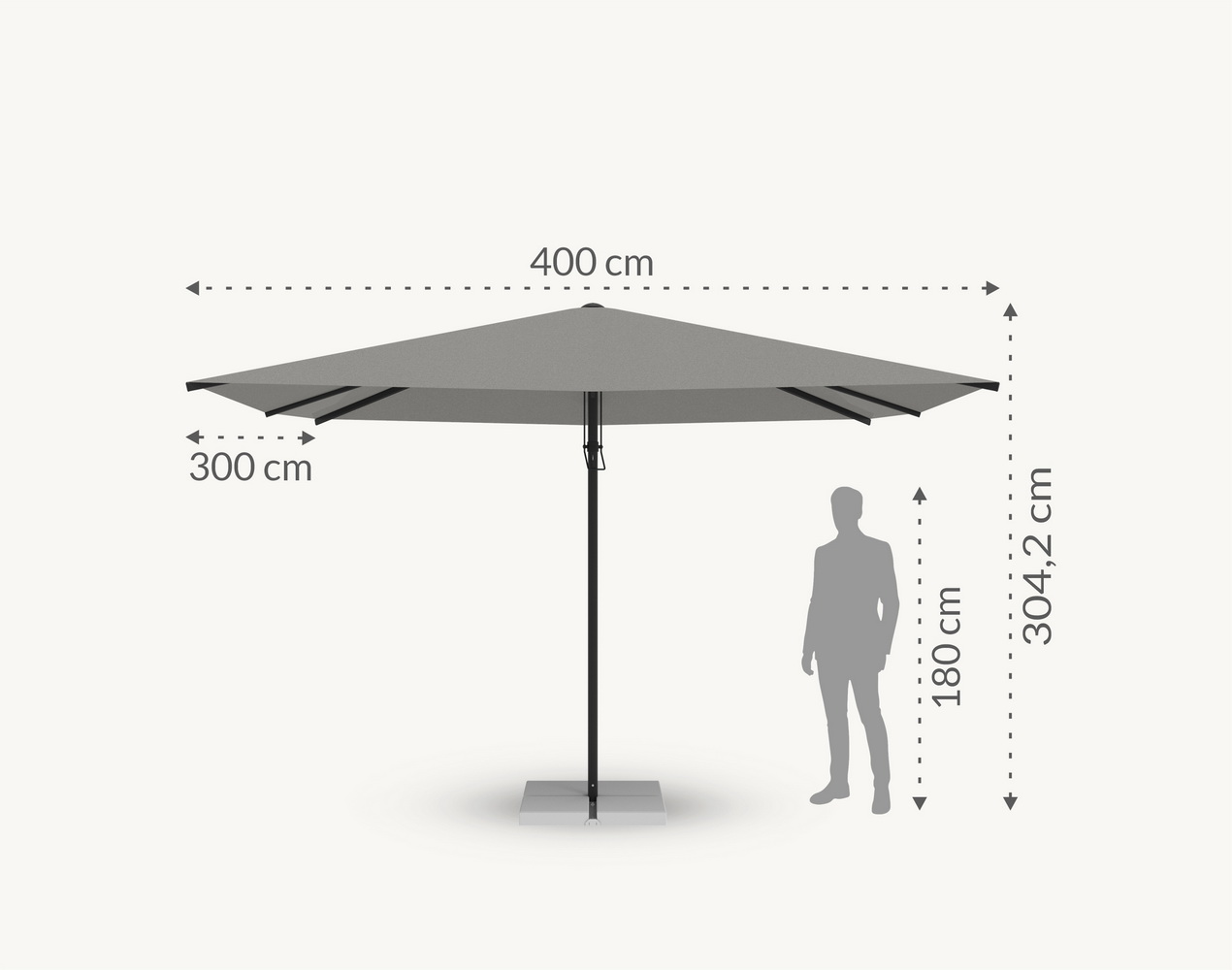 Dzięki ciężkiej podstawie o wadze 118 kg, parasol prostokątny Palamos pozostaje stabilny nawet przy podmuchach do 38 km/h, co przekłada się na pewność i spokój podczas użytkowania. To trwałe, odporne rozwiązanie umożliwia bezpieczne korzystanie z parasola w zmiennych warunkach zewnętrznych.
