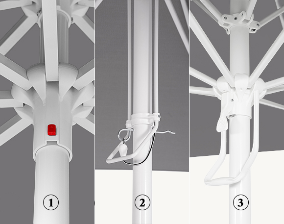Parasol Rodos oferuje trzy rodzaje systemów otwierania dopasowane do różnych wariantów rozmiarowych, zapewniając komfort i bezpieczeństwo użytkowania. Wariant (1) 2,5 m wykorzystuje prosty mechanizm klik-przeskok, który sygnalizuje pełne rozłożenie czaszy charakterystycznym dźwiękiem. W rozmiarach (2) 3 m i 3,5 m zastosowano mechanizm przeskok-rączka z dodatkową szpilką zabezpieczającą przed przypadkowym zamknięciem. Największy wariant (3) 4 m wyposażony jest w nowoczesny teleskopowy system, który podczas zamykania utrzymuje bezpieczny dystans między czaszą a meblami ogrodowymi, ułatwiając aranżację przestrzeni i chroniąc meble przed uszkodzeniem.