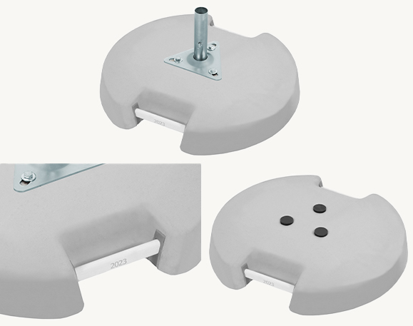 Parasol Rodos wyposażony jest w solidną betonową podstawę, której masa została dopasowana do rozmiaru parasola, gwarantując stabilność i bezpieczeństwo konstrukcji w codziennych warunkach użytkowania. Taka podstawa zapobiega przewróceniu parasola nawet podczas silniejszych podmuchów wiatru, co zwiększa komfort i spokojny relaks w cieniu parasola, dokładnie tak, jak lubisz.