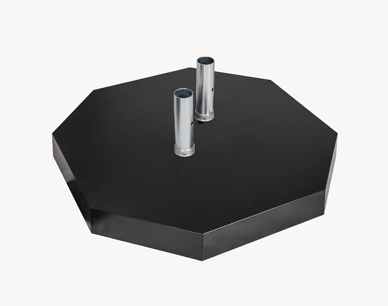 Podstawa Ibiza/Ibiza Quattro z nakładką to stabilne i estetyczne wsparcie parasola, szczególnie tam, gdzie liczy się pewność mocowania i spójny wygląd wyposażenia. Konstrukcja opiera się na stalowej kratownicy oraz czterech betonowych bloczkach, które łącznie dają masę 172 kg – ciężar skutecznie dociąża parasol i ogranicza jego pracę przy podmuchach wiatru. Każdy bloczek ma ergonomiczne uchwyty, co ułatwia przenoszenie elementów osobno i pozwala wygodniej zorganizować montaż. Aluminiowa nakładka zabezpiecza konstrukcję i wizualnie dopasowuje się do koloru stelaża, dzięki czemu całość wygląda elegancko. Podwójna stalowa nasada pewnie prowadzi maszt, zwiększając stabilność i komfort użytkowania. Materiały odporne na warunki atmosferyczne i korozję sprawiają, że podstawa sprawdza się w długim sezonie i zachowuje funkcjonalność przez lata.