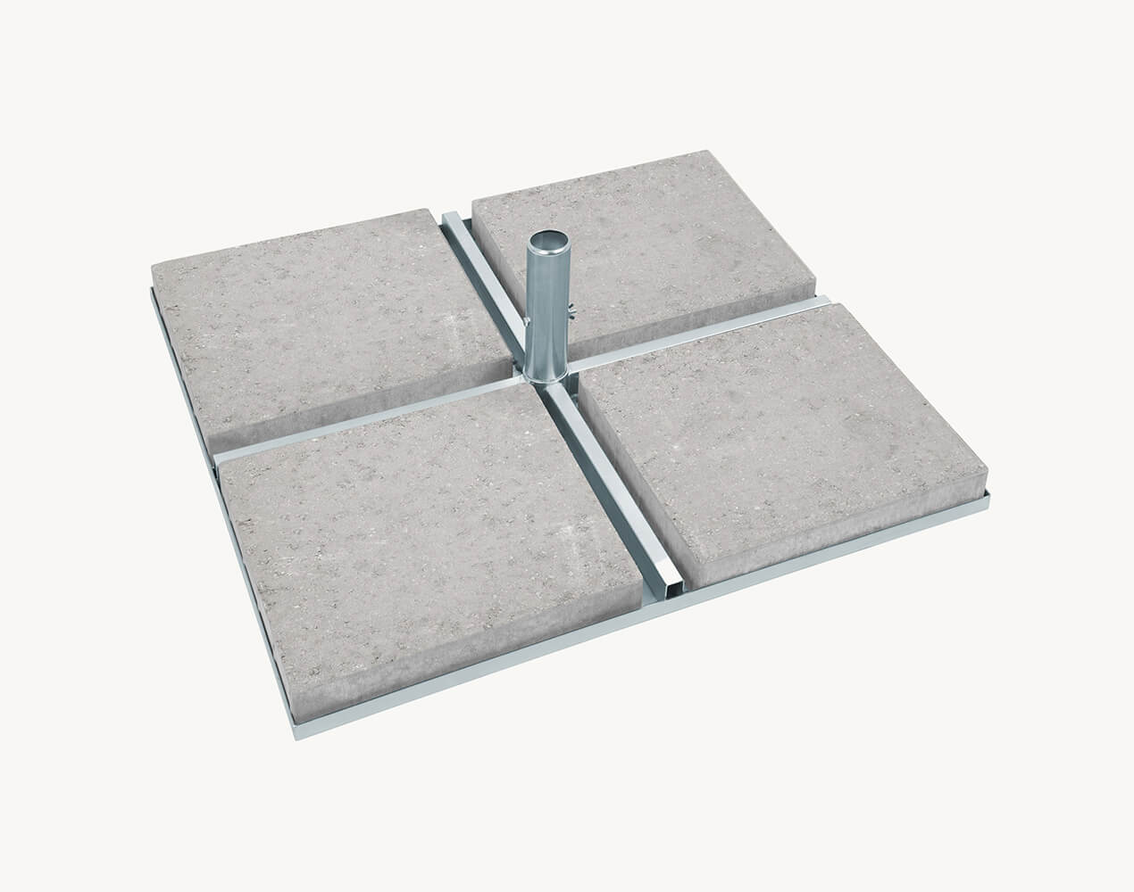 Podstawa Vesuvio/Vesuvio Quattro została przygotowana do obsługi większych parasoli, gdzie liczy się maksymalna stabilność i łatwe utrzymanie akcesoriów w dobrej kondycji. Betonowa, kwadratowa konstrukcja o wadze 173 kg skutecznie stabilizuje maszt i pomaga ograniczyć drgania czaszy przy silniejszych podmuchach wiatru. Stalowa nasada zapewnia pewne osadzenie rury parasola, co przekłada się na stabilny pion i większy komfort korzystania z cienia. Praktyczną zaletą są wymienne płyty betonowe – w razie uszkodzenia lub naturalnego zużycia można je zastąpić elementami dostępnymi w sklepach budowlanych, bez konieczności wymiany całej podstawy. To rozwiązanie wygodne w serwisowaniu, szczególnie w miejscach intensywnie użytkowanych. Odporność na warunki atmosferyczne i korozję sprawia, że podstawa zachowuje trwałość oraz estetyczny wygląd przez kolejne sezony.