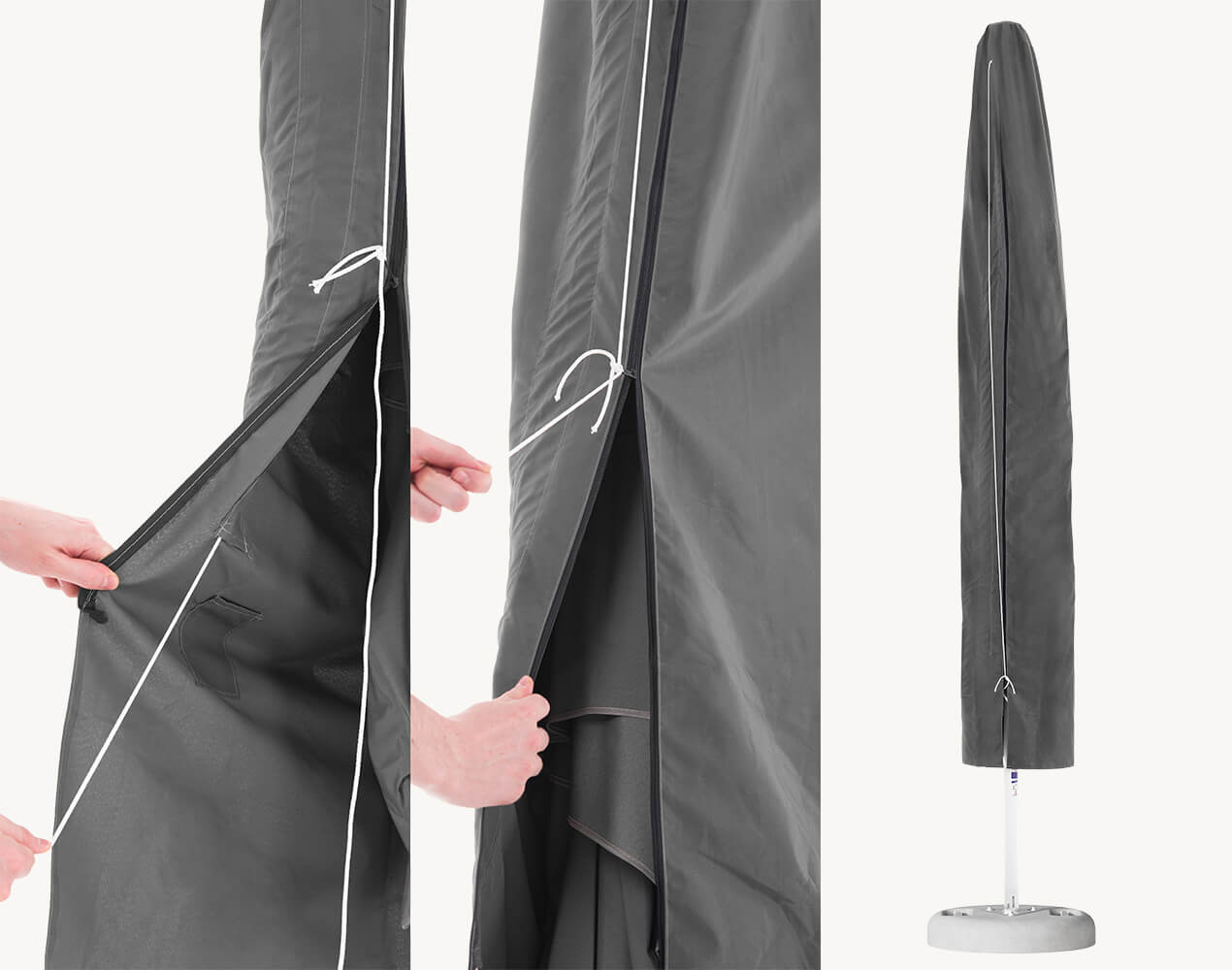 Pokrowiec na parasol Barbados 2,5 m składa się z wodoodpornej tkaniny kolorze szarym, z wygodnym zapięciem na zamek.