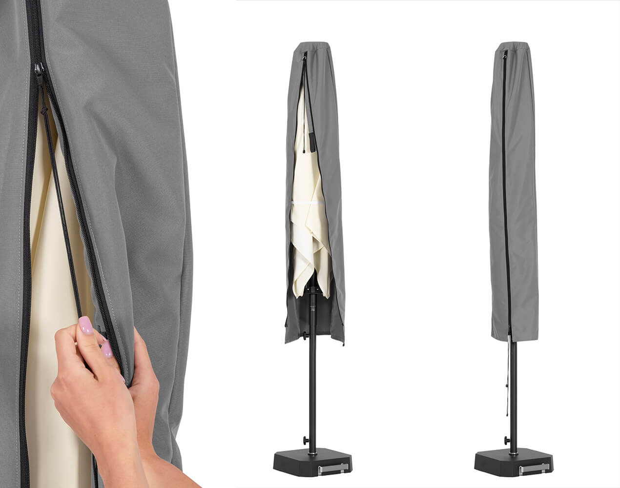 Pokrowiec na parasol Harmony składa się z wodoodpornej tkaniny kolorze szarym, z wygodnym zapięciem na zamek.