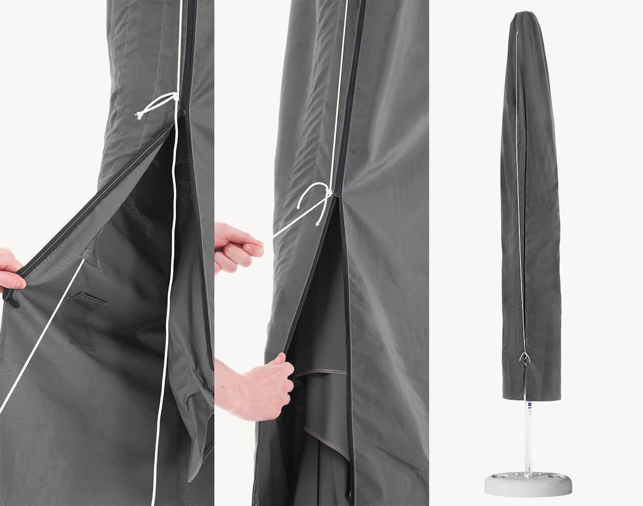 Pokrowiec na parasol Rodos 2,5 m składa się z wodoodpornej tkaniny kolorze szarym, z wygodnym zapięciem na zamek.